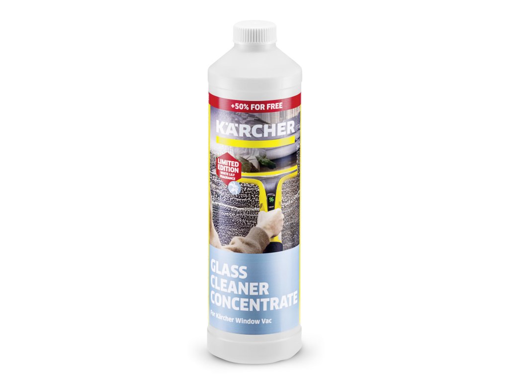 Kärcher Koncentrát na čistenie skla RM 500 účinne odstraňuje aj odolné nečistoty, ako sú mastnota, hmyz a emisie, pričom zanecháva povrchy bez šmúh.