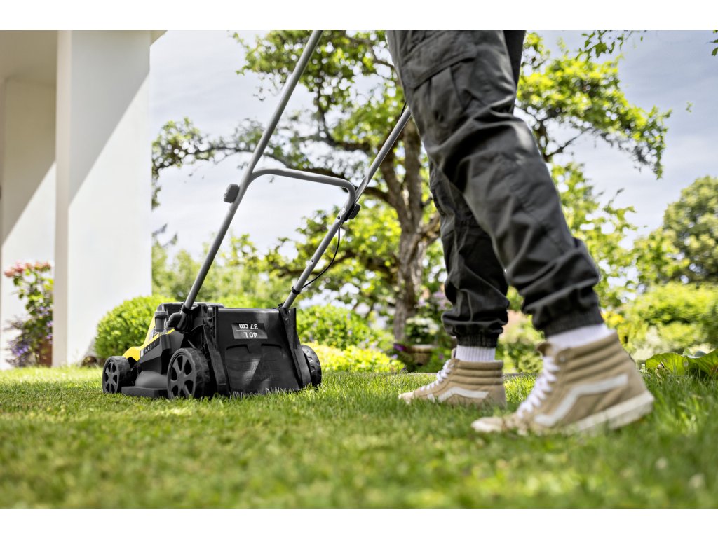 ✔ Ergonomický dizajn – výškovo nastaviteľná vodiaca rukoväť a penová rukoväť zabezpečujú pohodlnú pracovnú polohu. Sklopný rám a skladací textilný zberný kôš umožňujú úsporné skladovanie.
