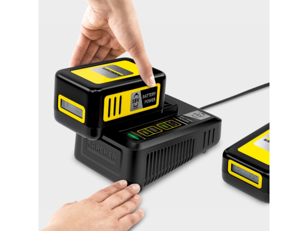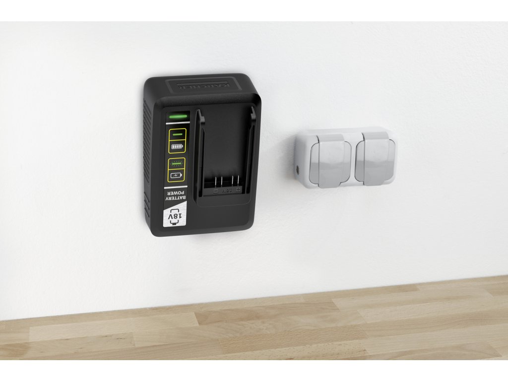 Rýchlonabíjačku je možné upevniť úplne jednoducho na stenu pomocou integrovaného nástenného držiaka. Vďaka rýchlonabíjačke je možné nabiť vymeniteľnú batériu 18 V/2,5 Ah Kärcher Battery Power na 80 % iba za 44 minút. Je možné nabíjať aj všetky ostatné vymeniteľné batérie 18 V Battery Power systému batérií 18 V Kärcher Battery Power.