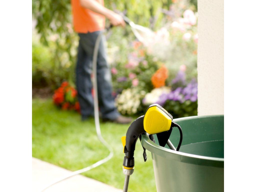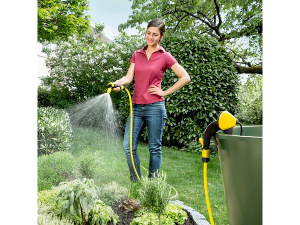 Čerpadlo Kärcher BP 1 Barrel Set je efektívnym a ekologickým riešením na zavlažovanie záhrady dažďovou vodou zo sudov alebo nádrží. Tento set obsahuje všetko potrebné na okamžité použitie, vrátane 15 m hadice PrimoFlex®, zavlažovacej pištole a univerzálnych hadicových prípojok s funkciou Aqua Stop.