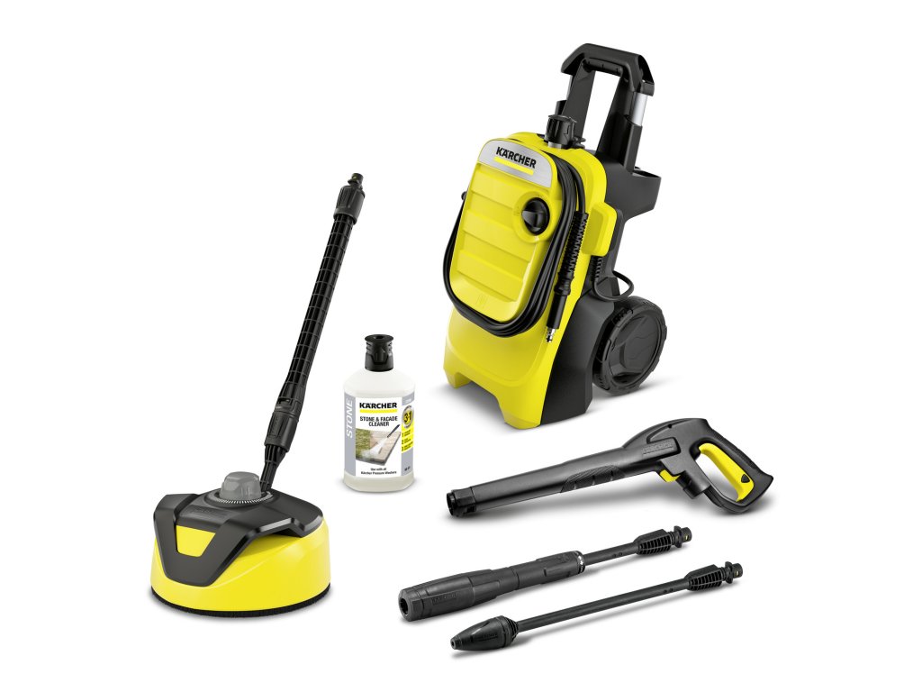 Model K 4 Compact s vodou chladeným motorom a plošným výkonom 30 m²/h je ideálny na príležitostné čistenie miernych nečistôt, napríklad malých áut, záhradných plotov či bicyklov. Home Kit obsahuje čistič povrchov T 5 na efektívne čistenie väčších plôch bez striekajúcej vody a čistič kameňa a fasád (1,0 l).